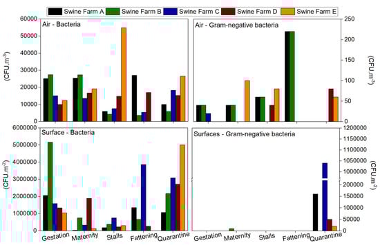 Regarding surface samples, mesophilic bacterial population ranged from 3 × 104 to 516 × 104 CFU·m−2, with the highest median value found in Swine Farm C (192 × 104 CFU·m−2), followed by Swine Farms A, B, D and E with mean values of 93.4 × 104, 182.4 × 104, 128.4 × 104 and 162 × 104 CFU·m−2, respectively. Gram-negative bacteria ranged between 0 and 104 × 104 CFU·m−2, with only one sampling site in each swine farm presenting coliform growth (Gram-negative bacteria), mainly in the “quarantine” and in the “maternity” area in Swine Farm B.