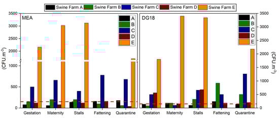 Fungal load distribution in the five assessed swine farms. The dashed line represents the reference limits suggested by the World Health Organization (WHO).