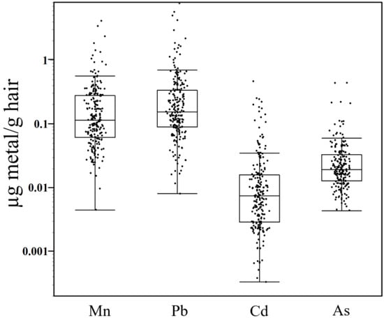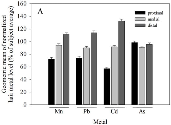 Associations between the levels of different metals in hair could suggest similar exposure sources. Spearman’s correlation analysis of metal levels in all hair samples of male (proximal segment) and female (proximal, medial, and distal segments) subjects shows that all four metals are highly correlated (p < 0.0001), with the correlation between Cd and Pb being strongest (Spearman’s ρ = 0.5780), followed by the correlation between Mn and Cd (ρ = 0.4475), and Mn and Pb (ρ = 0.3513). Correlations between As and the other three metals were weaker (ρ < 0.21) (Table 2).