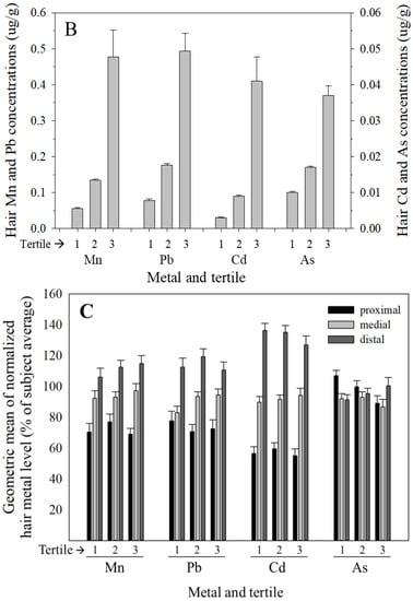 (A) Normalized hair Mn, Pb, and Cd, but not As levels systematically increase from proximal to distal two centimeter hair segments from female subjects. Normalized hair metal levels (%) for each segment were calculated by dividing the hair segment metal concentration by the average of all three segments (proximal, medial, distal) for each individual subject. Data are geometric mean (±SE) for all female subjects (n = 153–155 per segment and metal); (B) Hair Mn, Pb, Cd, and As concentrations differ by ≥5-fold between the lowest and highest tertiles of hair metal levels. Data are mean (±SE) three-segment average of female subjects segregated into tertiles (n = 56–57 per tertile and metal); (C) The relative increase in hair Mn, Pb, and Cd levels from proximal to distal segments is comparable for subjects with lower (first tertile) versus higher (third tertile) hair metal levels (see text for details).