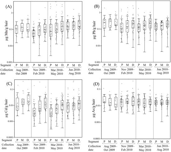 Hair segment Mn (A), Pb (B), Cd (C), and As (D) levels in females (µg/g, note log scale) vary with season of collection. Hair metal levels are plotted by three to four months season of collection intervals. The horizontal line within the box represents the median, while the upper and lower margins of the boxes represent the 75th and 25th percentiles; the whiskers are drawn to the furthest data point within 1.5 times the interquartile range. Only female subjects with proximal (P), medial (M), and distal (D) hair segments are shown (n = 153–155 subjects per metal).