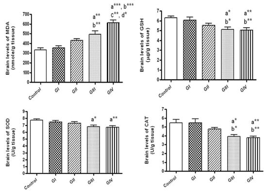 The brain levels of oxidative stress markers in normal control and different ZnONPs-treated groups. Data are expressed as mean ± SEM. a: significantly different from normal control; b: significantly different from G I; c: Significantly different from G II; d: Significantly different from G III. * p < 0.05; ** p < 0.01; *** p < 0.001. MDA: Malondialdehyde (the index of lipid peroxidation), GSH: Reduced glutathione (a non-enzymatic antioxidant), SOD: superoxide dismutase; CAT: Catalase (enzymatic antioxidants). G I & G II: rats treated with 40 and 100 mg/kg for 24 h, respectively. G III & G IV are rats treated with 40 and 100 mg/kg/day for 7 days, respectively.