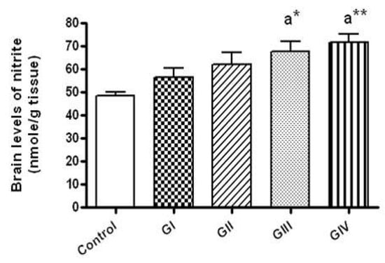 The biologically produced nitric oxide (NO) is rapidly oxidized to nitrite and nitrate, therefore, nitrite levels can reflect NO production. Nitrite was assessed colorimetrically using Griess reagent (a mixture of equal volumes of 1% sulfanilamide in orthophosphoric acid (2.5%) and 0.1% N-(1-naphthyl) ethylenediamine in distilled water) [41]. The reaction mixture was 100 µL of brain homogenate and 100 µL Griess reagent, incubated for 10 min at room temperature. The absorbance of the developed orange color was read at 540 nm.