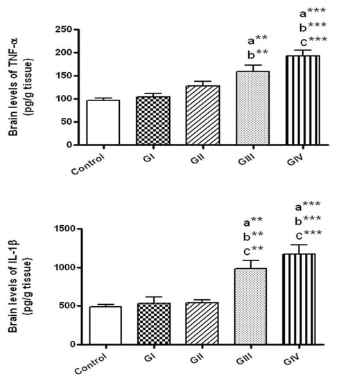 The brain levels of the inflammatory markers in normal control and different ZnONPs-treated groups. Data are expressed as mean ± SEM. a: Significantly different from normal control; b: Significantly different from G I; c: significantly different from G II. ** p < 0.01; *** p < 0.001. TNF-α: tumor necrosis factor-α; IL-1β: interleukin-1β. G I & G II: Rats treated with 40 and 100 mg/kg for 24 h, respectively. G III & G IV are rats treated with 40 and 100 mg/kg/day for 7 days, respectively.