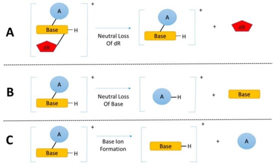 The fragmentation pathways of modified nucleosides analyzed by LC-MS. (A) The major fragmentation of the modified nucleosides is the neutral loss of deoxyribose. Other common fragmentations include (B) the neutral loss of base and (C) the neutral loss of the adduct with the formation of base ions [].