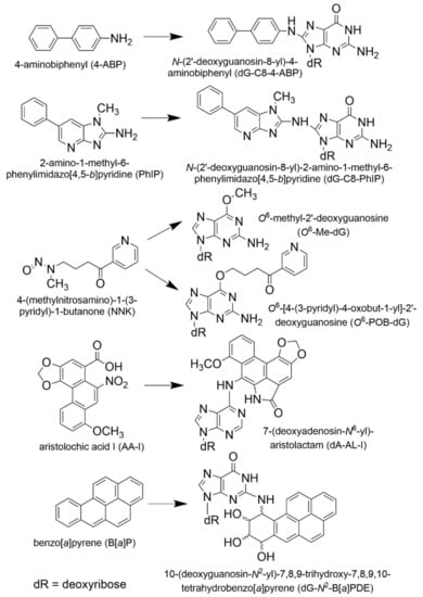 - Poirier, M.C.; Santella, R.M.; Weston, A. Carcinogen macromolecular adducts and their measurement. Carcinogenesis 2000, 21, 353–359. [Google Scholar] [CrossRef] [PubMed]