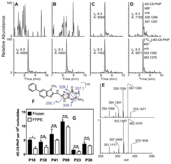 Extracted ion chromatograms of dG-C8-PhIP and 13C-labeled dG-C8-PhIP of DNA from fresh frozen and FFPE human prostate tissues at the MS3 scan stage. (A) Fresh frozen prostate and (B) paired FFPE block of a patient who was negative for dG-C8-PhIP; (C) fresh frozen prostate and (D) paired FFPE block of a patient who was positive dG-C8-PhIP at MS3 scan stage. The structure and proposed fragmentation mechanism of aglycone of dG-C8-PhIP are depicted fresh frozen prostate and (D) paired FFPE block of a patient who was positive for dG-C8-PhIP. (E) The product ion spectra at MS3 of unlabeled and 13C-labeled dG-C8-PhIP are shown. (F) Levels of dG-C8-PhIP in paired fresh frozen prostate and FFPE blocks of six patients are shown in (G). The levels of adducts are reported as adducts per 108 nucleotides. * p < 0.05; n.s., statistically not significant. Reproduced with permission from []. Copyright ACS, 2017.