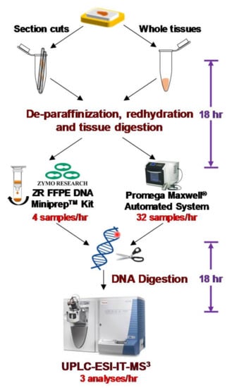 The method of DNA isolation from FFPE tissues employing the FFPE miniprep kit (Zymo Research) is robust; however, it is a manual and labor-intensive technique and cannot facilely process the large number of samples required for epidemiological studies. We developed a rapid throughput method of DNA isolation from FFPE tissue employing a semi-automated commercial DNA isolation system, Promega Maxwell® 16 MDx system, which is used for genomic research []. The system employs silica-magnetic beads technology for DNA isolation and can process 32 samples per hour compared to 4–6 samples per hour by the manual method. The DNA recovered from FFPE tissues using the Promega Maxwell® 16 MDx is fully digestible by nucleases []. The levels of dA-AL-I, dG-C8-4-ABP, and dG-C8-PhIP recovered from DNA of FFPE tissues extracted by rapid throughput method are comparable to those levels measured from DNA isolated by phenol-chloroform in matching frozen tissues, and in DNA of FFPE tissues isolated by the commercial manual Zymo kit []. With this advancement in DNA isolation technology, we believe that archived FFPE tissues can be used to screen for DNA adducts in large population studies. A scheme and the time of duration of the procedure to isolate DNA from FFPE section cuts or whole tissues, and ensuing chemical analysis by mass spectrometry, are depicted in Figure 8. The recovery of DNA from FFPE tissues and DNA digestion steps require overnight incubation with enzymes to achieve optimal digestion efficiency. The targeted and simultaneous quantification of a selected number of DNA adducts, by UPLC-ESI-IT-MS3, can be achieved in a 10 to 15 min run time.