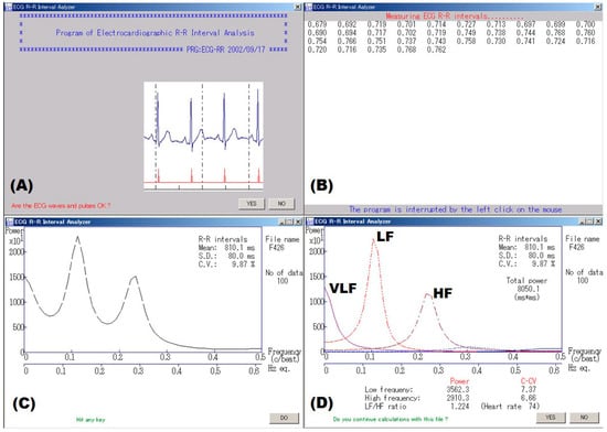 An example of spectral analysis of ECG R‒R intervals. (A) An examiner confirmed waveforms on the electrocardiogram. (B) Electrocardiographic 300 R‒R intervals or 5-min R‒R intervals were measured in real time. (C) Spectral analysis using autoregressive model was made for consecutive 100 R‒R intervals with the minimal standard deviation (SD) that were automatically extracted from the obtained data, and (D) component analysis was made for the data. Finally, a coefficient of variation (C.V. or CVRR) was calculated from the mean and SD of the same data. VLF, LF, and HF represent very low frequency, low frequency and high frequency bands, respectively.