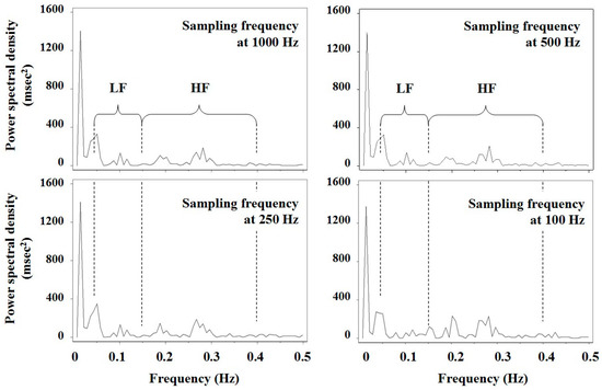 To examine the effect of sampling frequency on LF and HF, 128 consecutive R‒R intervals with the minimal SD in 61 male students aged 18–26 years [35] were reanalyzed using FFT spectral analysis, as shown in Figure 2. The original R‒R intervals were measured at a sampling frequency of 1000 Hz after each subject rested in a supine position for 10 min, and data for lower sampling frequencies (500 Hz, 250 Hz, 200 Hz, 125 Hz, and 100 Hz) were generated from the original data taking into account random error. Table 3 presents the HRV parameters calculated by the spectral analysis. All the HRV parameters were significantly different among six frequency-band groups. In particular, most of significant differences were observed between sampling frequency bands of less than 200 Hz and 200–1000 Hz.