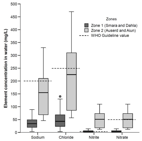 | Elements and Anions | Zone 1 (n = 12) | Zone 2 (n = 12) | p | Total (n = 24) | WHO/US Guideline Values [4,28] | |||