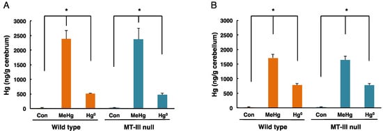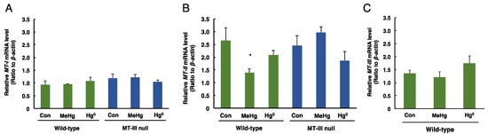 3.3. The Levels of MT-I, MT-II, MT-III mRNAs in the Cerebrum and Cerebellum after Mercury Exposure
