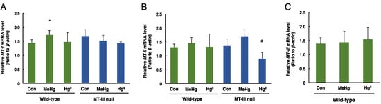 - Yao, C.P.; Allen, J.W.; Mutkus, L.A.; Xu, S.B.; Tan, K.H.; Aschner, M. Foreign metallothionein-I expression by transient transfection in MT-I and MT-II null astrocytes confers increased protection against acute methylmercury cytotoxicity. Brain Res. 2000, 855, 32–38. [Google Scholar] [CrossRef]