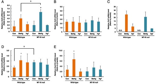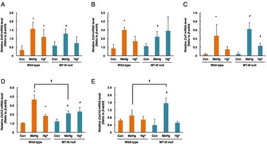 - Kim, M.S.; Takahashi, T.; Lee, J.Y.; Hwang, G.W.; Naganuma, A. Global chemokine expression in methylmercury-treated mice: Methylmercury induces brain-specific expression of CCL3 and CCL4. J. Toxicol. Sci. 2013, 38, 925–929. [Google Scholar] [CrossRef] [PubMed]