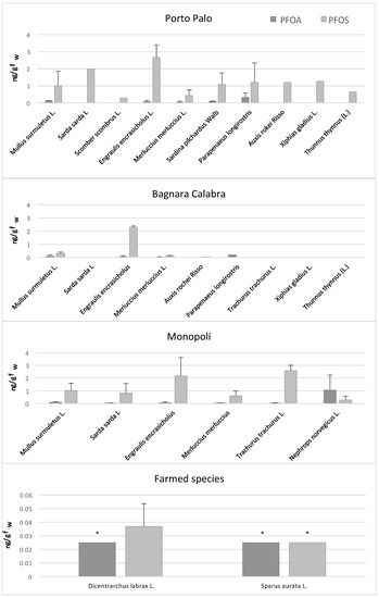 Figure 1 shows the PFOA and PFOS concentrations in the samples analyzed. From that figure, it is evident that levels of both chemicals in the farmed sea bass (Dicentrarchus labrax L.) and sea bream (Sparus aurata L.) are at least one order of magnitude lower than those measured in the wildlife of the Mediterranean Sea. These results seem to indicate that contamination from PFOS and PFOA arises from food through biomagnification rather than directly from water (bioconcentration) since the farmed fish analyzed have been sampled in offshore cages of the aquaculture plants. A larger set of samples should be performed in order to provide better statistics, especially if there is an interest in Species-Specific risk assessment.