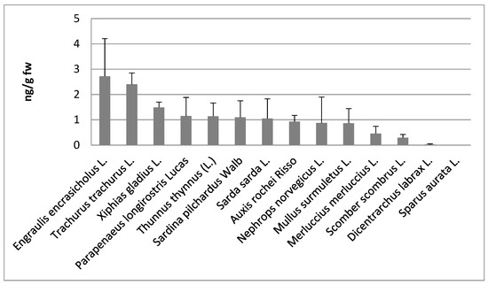 Among the wildlife, the highest concentrations of PFOS were found in anchovy (Engraulis encrasicholus L.), 2.7 ± 1.5 ng/g fw, followed from horse mackerel (Trachurus trachurus L.), 2.4 ± 0.4 ng/g fw, whereas the lowest in hake (Merluccius merluccius L.), 0.46 ± 0.29 ng/g fw, and Atlantic mackerel (Scomber scombrus L.), 0.29 ± 0.13 ng/g fw (Figure 2). Thus, from these data, it is not evident that organisms at higher position in the food chain have higher contamination levels of PFOS and PFOA. That could be due to the different behavior of these chemicals in the bioaccumulation process, since PFOS and PFOA do not accumulate into the fat tissues, as the typical POPs, but they bind serum and liver proteins. However, further studies with a greater number of samples should be performed to confirm this hypothesis.