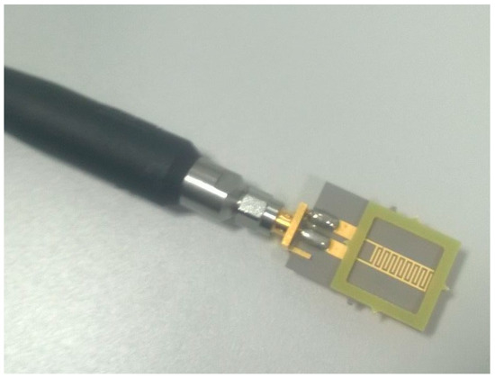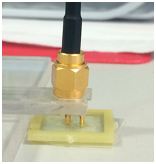 The third method examined was an electromagnetic wave sensor whereby the reflected power S11 was measured. A PTFE 8pr Au sensor (Figure 2) connected to a Vector Network Analyser (VNA, Rhode and Schwarz ZVA24) via one port was used to generate and receive a signal consisting of 60,000 data points from 10 MHz to 15 GHz. 400 µL of each sample was pipetted into the FR4 reservoir for measurements; this was repeated five times for each sample.