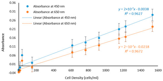 Linear increase in the value of the Absorbance with cell density at 450 nm (R2 = 0.9627) and 650 nm (R2 = 0.9672).