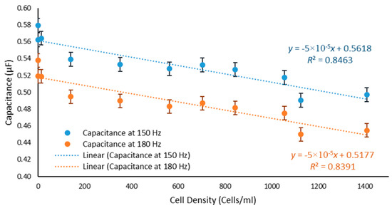 Two frequencies, 150 Hz and 180 Hz, were selected and a graph showing a decrease in the value of the measured capacitance with increasing cell density is depicted in Figure 4. Statistical analysis of the data reveals that the R2 values for capacitance at 150 Hz and 180 Hz were 0.8463 and 0.8391, respectively. Furthermore, using the capacitance Equation (2) for a capacitor with two cylindrical rods, the dielectric constant of the material can be calculated. This can then be used as a database to detect the pollutant for a certain capacitance value.