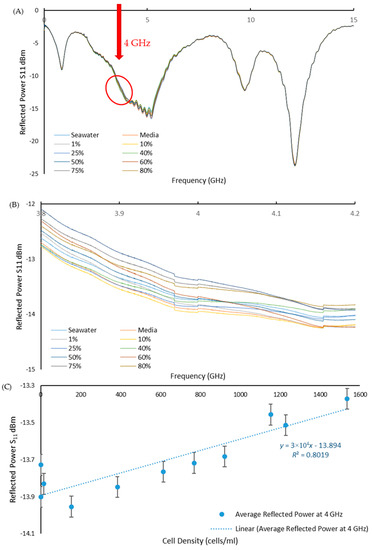 The reflected power spectra were measured across the full frequency range to assess the sensors ability to detect the range of T. suecica concentrations (Figure 5A). Looking closer at around 4 GHz, Figure 5B shows the change in amplitude of the reflected power with cell concentration. As shown in Figure 5C, a selected frequency of 4 GHz provides a linear (R2 = 0.8019) calibration curve for change in the reflected power versus the cell density. This confirms that the planar electromagnetic wave sensor operating at microwave frequency range presents a viable option for real-time monitoring of water pollution with living organisms.
