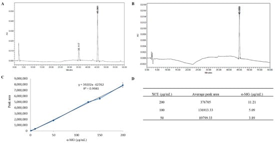 Crude xanthone extraction. High performance liquid chromatography (HPLC) chromatogram profile of (A) xanthone crude extract (XCE) and (B) pure α-mangostin (α-MG) samples. The same characteristic peak was identified at the same retention time of 45 min. Standard curve of pure α-MG (μg/mL) (C) was plotted to determine xanthone concentration in XCE. (D) showed the total α-MG content within XCE (μg/mL). Error bars showed the standard error of the mean (SEM).