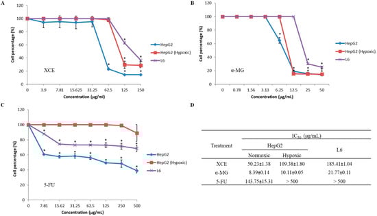 The cytotoxic effect of (A) XCE, (B) α-MG, and (C) 5-FU on HepG2 (both hypoxic and normoxic conditions) and L6 cell lines. (D) Cells were treated with a series of concentrations to obtain half maximal inhibitory concentration (IC50) of the treatment compound against cell survivability. All experiments were repeated thrice with five technical replicates. Error bars showed the SEM. Asterisk (*) showed the significant (p < 0.05) difference between cell groups at each concentration. Experiments were analyzed using single ANOVA.