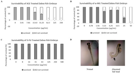 The toxicity of (A) XCE, (B) α-MG, and (C) 5-FU on zebrafish embryos. Experiments were statistically analyzed using two-tailed Student’s t-test. Asterisk (*) shows the significant (p < 0.05) difference between the treatment group and the untreated group (the concentration of 0 μg/mL of the compound or extract). All experiments were repeated five times. (D) shows the representative image of tail-bend malformation of embryos (arrow) treated with α-MG. No XCE and 5-FU treated embryos were found to exhibit any malformation.