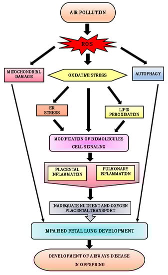 It has been established that air pollution causes oxidative stress by impairing cellular endogenous antioxidant production capabilities and thus increasing ROS generation []. This increase in ROS leads to mitochondrial dysfunction and oxidative stress which can further damage the tissue by modifying the function of vital proteins such as NADH-ubiquinone reductase, succinate-ubiquinone reductase, cytochrome c oxidase []. Increases in ROS is also known to causes endoplasmic reticulum (ER) stress leading to the upregulation of inflammatory genes as well as impairment of the autophagic process, thus further aggravating the pathogenesis. Autophagy is a protective catabolic process which facilitates lysosomal-mediated degradation or clearance of misfolded or unwanted proteins. Oxidative stress causes ER stress and lipid peroxidation, resulting in mitochondrial dysfunction and pulmonary and placental inflammation; this negatively affects the nutrient and fetal oxygen transport system, ultimately leading to impairment in fetal lung development [,,,,]. Similarly, maternal exposure to air pollution causes oxidative stress and mitochondrial impairment in the fetus which triggers pulmonary and placental inflammation and negatively affects nutrient and oxygen transport []. Moreover, adsorbed transition metals in air pollution further aggravate ROS generation by the process of Fenton’s reaction []. Fenton’s reaction leads to the subsequent activation of cellular signaling cascades and the activation of inflammatory cells and release of pro-inflammatory cytokines leading to pulmonary and placental inflammation [,]. Figure 1 summarizes how in uteral air pollution-induced ROS generation and subsequent cellular oxidative stress can affect a variety of cellular functions leading to impairment of fetal lung growth and ultimately the development of airway disease in children.