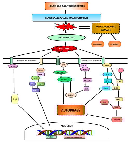 Cellular mechanisms involved in maternal exposure to air pollution. Air pollutants enter the lungs while breathing and increases ROS generation resulting in oxidative stress. Increase in ROS causes mitochondrial damage which can initiate cell death through various mechanisms. Oxidative stress induces ER stress that allows immunoglobulin binding protein (BiP) to bind misfolded ER proteins and release activating transcription factor-6 (ATF-6), which is then transported to Golgi apparatus and cleaved to 50 kDa form-ATF6 (p50). p50 in the nucleus drives transcription of many acute phase response (APR) and inflammatory genes. ER stress also activates inositol-requiring enzyme 1 alpha (IRE1α) kinase which recruits receptor-associated factor 2 (TRAF2) leading to the phosphorylation of Jun N-terminal kinase (JNK) and enhances activator protein-1 (AP-1)-dependent transcription of various cytokines and chemokines. On the ER membrane, inositol 1,4,5-trisphosphate receptor (IP3R) interacts with Beclin-1 which inhibit autophagy. However, inhibition of IP3R initiates detachment from Beclin-1 leading to autophagy in absence of calcium. Interaction of TRAF2 with apoptosis signal-regulating kinase 1 (ASK-1) lead to JNK activation which promotes B-cell lymphoma-2 (Bcl-2) phosphorylation, leading to detachment from Beclin-1. PERK interaction to phosphorylated EIF2α can lead to autophagy through an interaction of activating transcription factor-4 (ATF-4) dependent autophagy-related gene-12 (Atg12) protein expression. Alternatively, P8 protein interaction with ATF-4 stimulates the up-regulation of pseudokinase tribbles homolog-3 (TRB3) which further leads to activation of autophagy by inhibition of the Akt/mTORC1 complex.