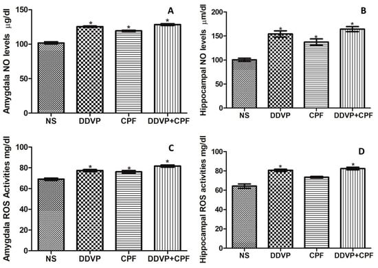 3.5. Effects of DDVP and CPF Exposures on Oxidative Stress Markers (ROS and NO) in the Amygdala and Hippocampus