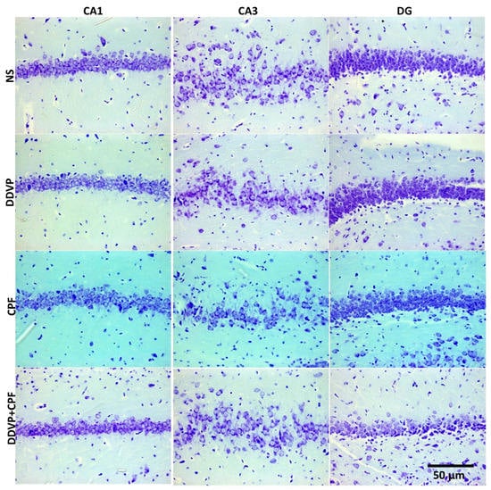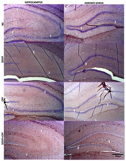 3.6. Effects of DDVP and CPF Exposures on the Distributions of Proliferative Nuclei (Ki67) in the Hippocampus and the Histoarchitecture