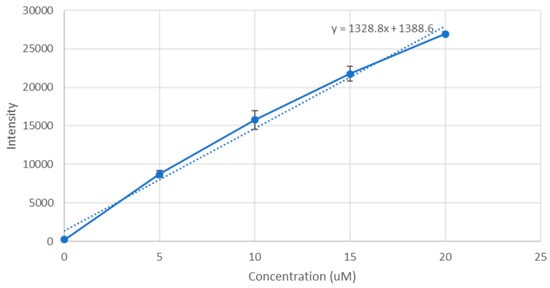 PerkinElmer microplate reader (Waltham, MA, USA) was used to measure their fluorescence intensity, and a standard curve of doxorubicin concentration against fluorescence intensity was plotted, shown in Figure 1. The fraction of doxorubicin present in the final nanoparticle suspension divided by the concentration originally used to form the nanoparticle suspension gives us the binding affinity.