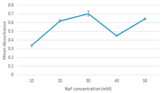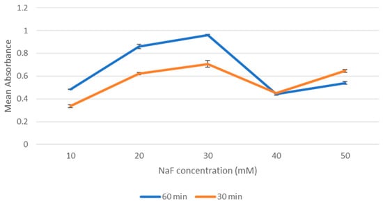 Fabrication of nanocrystals was assessed using absorbance measurements as an indication of nanoparticle formation. As shown in Figure 2, overall increase in absorbance values was observed with increasing NaF concentrations. Absorbance values were higher at 10 mM up to 30 mM and reduced at 40 mM. This dip at 40 mM was a persistent pattern observed across all repetitions of the experiment and may be accounted for by other factors unrelated to the actual absorption. This is addressed in the discussion section. Increasing the incubation time to 60 min resulted overall in an increase in absorbance values, as Figure 3 shows. Regarding the 50 mM point in Figure 3, that is likely an anomaly. The two values for 30 min and 60 min are close enough, and it seemed that incubation stops having an effect at 40 mM point probably due to the environment being saturated with NaF.