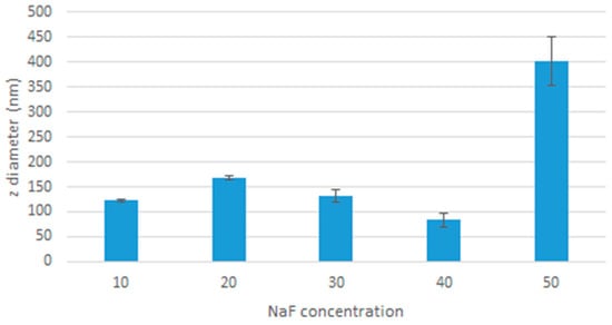 Particles were viewed (Figure 6) under a brightfield 10× microscope to visualise the pattern of particle growth as the concentration of NaF used in formulating the particles was increased. There was a trend for particle size to increase with NaF concentrations 10–30 mM, then drop at 40 mM, but pick up again at 50 mM. This pattern at 40 mM is consistent with the absorbance and dynamic light scattering observations.