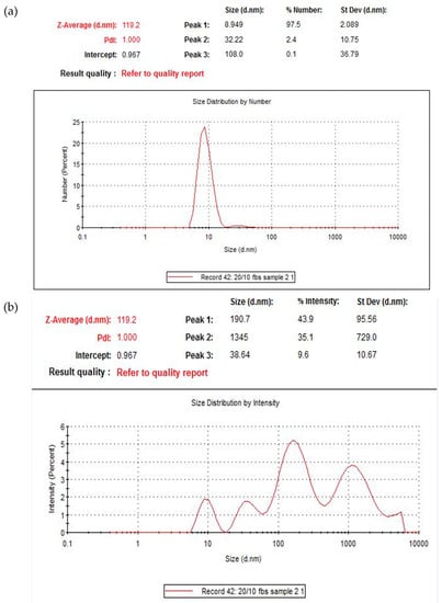 Size distribution of MgF2 particles in a suspension of 20 mM of MgCl2 and 10 mM of NaF in terms of a) % numbers b) % intensity.
