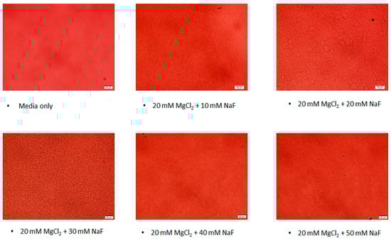 MgCl2 was fixed at 20 µL of 1 M and mixed with increasing concentrations of NaF; 10, 20, 30, 40, 50 µL of 1 M. The solution was incubated at 37 °C for 30 min, after which 10% FBS-supplemented DMEM was added to make a total of 1 mL. The pH was calibrated within the range of 7.4 to 7.55.