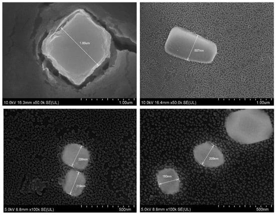 As shown in Figure 8, the particles formed were of a cubic shape. Their sizes ranged from 200 nm to 600 nm and 1 µm. As the images suggest, the majority of particles <200 nm, which is consistent with the dynamic light scattering size distribution graphs (Figure 5). The variety of particle sizes is consistent with the high polydispersity value of ‘1’ reported with dynamic light scattering data. Figure 9 shows EDX measured at two points on an SEM image. EDX analysis showed presence of Mg, F, Na, and Cl on the crystals.