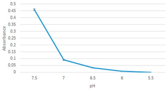 pH sensitivity of the particles was assessed through photometric absorbance of particles formulation in media of different pH. As Figure 10 shows, reducing the pH led to a decrease in absorbance values, indicating breakdown of the nanoparticles. The graph shows a steep decline in absorbance going from 0.4584 (at pH 7.5) down to 0.0904 (at pH 7.0), implying that most of the particles dissolved as you went down from 7.5 to 7.0. The particles were all dissolved by pH 5.5.