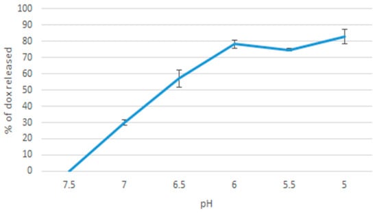 Decrease in fluorescence intensity of doxorubicin in MgF2-bound formulations as you reduce media pH from 7.5 to 5.0 was used to estimate the amount of doxorubicin released from the nanoparticles. Figure 12 shows that there was a general pattern of more doxorubicin being released as pH decreased, in line with the results observed with pH sensitivity of the nanoparticles. A gradual increase was observed from 7.5 to 6.0. The highest release percentage was observed at pH of 5, where 83% of doxorubicin was released.