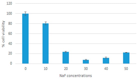 The toxicity of MgF2 particles was assessed by calculating the percentage of cell viability for the different formulations of MgF2. These percentages were based on the results of MTT assays (see methods). As Figure 14 shows, there was an overall decrease in cell viability with increasing NaF concentrations. A cell viability of 80% (p = 0.0414) was observed with 10 mM NaF. As a result, 10 mM of NaF was chosen for further experimentation. Cell viability at 20 was 24% (p = 0.0002), 30 was 8% (p < 0.0001), 40 was 12% (p < 0.0001), 50 was 22% (p < 0.0001).