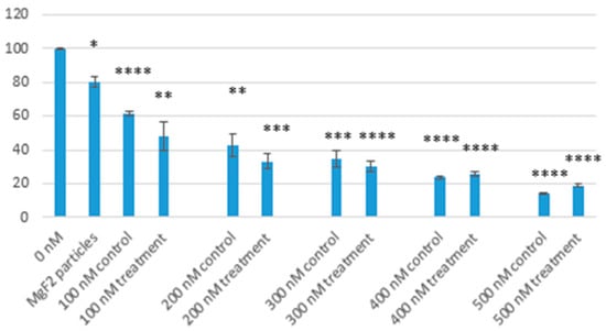Comparing cell viabilities of MgF2 nanoparticle, doxorubicin-bound MgF2 particles and free drug controls. Control = drug in media; Treatment = particle-bound doxorubicin, as described; * = p value 0.05–0.01; ** = p value 0.01–0.001; *** = p value 0.001–0.0001; **** = p value < 0.0001; p values were calculated using 0 nM for comparison.