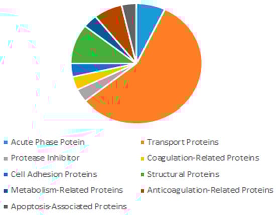 Figure 16 is a pie chart that shows the distribution of proteins in the corona by functions. As the figure showed, transport proteins made up the largest segment (57%) of the protein corona. This included albumen proteins, which are the most abundant proteins in plasma, constituting around 55% of plasma proteins [], and are known dysopsonins, i.e., inhibit opsonisation. Opsosnins such as globulins, complement proteins and fibrinogen were missing in the corona [].