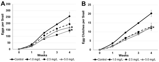 The cumulative mean of eggs/snail (Mean ± SE) in the control at the end of 4 weeks was 253.6 ± 31.9, and at the concentrations of 1.0 mg/L (194.8 ± 30.4); 2.5 mg/L (145.9 ± 48.6); and at 5.0 mg/L (169.1 ± 30.3), respectively (Figure 2A). For egg-clutches/snail, the cumulative mean (Mean ± SE) in the control group was 20.3 ± 1.7, and at the concentrations of 1.0 mg/L (12.9 ± 1.5); 2.5 mg/L (12.6 ± 1.1); and at 5.0 mg/L (12.4 ± 2.1), respectively (Figure 2B).