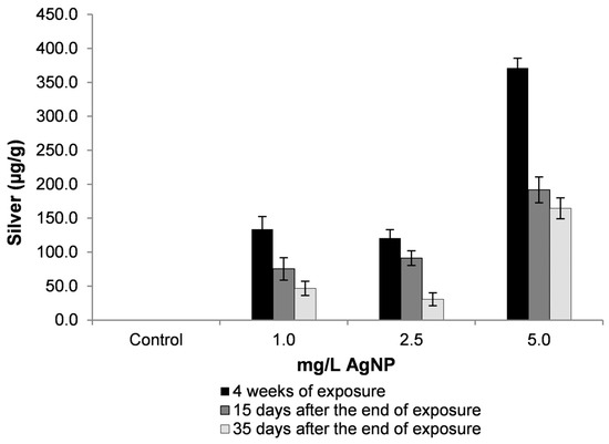 Results observed in Figure 3 present the amount of silver in the whole body of snails after exposure to AgNPs. These data show how high the total amount of silver in the snail body can be in relation to the exposure concentration and to the control group. On the other hand, the elimination rate seems to be proportional, over time, after the experimental aquatic contamination had ended.
