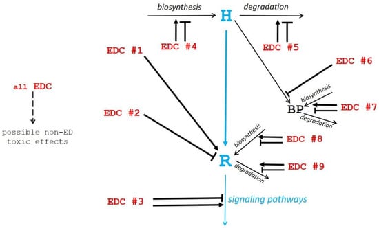 Schematic view of potential mechanisms of action of endocrine disruptor compounds (EDCs). The physiological hormonal mechanism is shown in blue. The diverse EDC mechanisms of action (EDC #1 to EDC #9 in red) as described in the text, are shown by black arrows pointing to their site of action (→ stimulation; ─┤ inhibition).