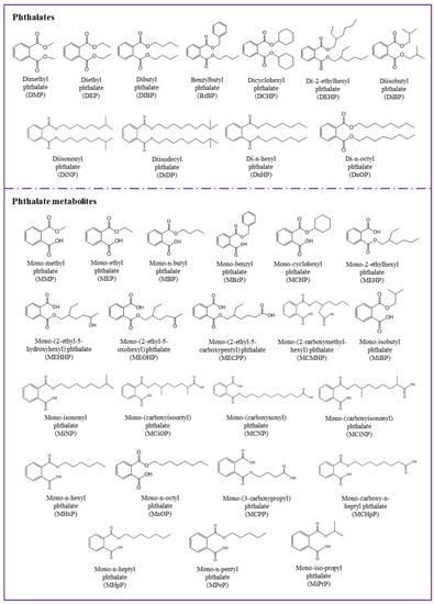 Major phthalate diesters and their corresponding metabolites studied in the literature.