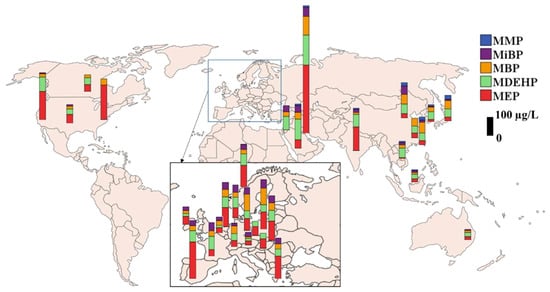Children: The NHANES data showed that the concentrations of urinary phthalate metabolites in children 6–11 years old were higher than those in adolescents and adults []. Several studies support the CDC’s findings that children have higher urinary concentrations than do adults of DBP, BzBP, and DEHP [,]. Differences in urinary concentrations of phthalates among infants, children, and adults may reflect different sources and routes of intake. Ingestion is thought to be a primary pathway of exposure to some phthalates, especially those in food packaging []. The mouthing behavior of infants and toddlers could potentially increase their exposures to phthalates in toys and other products made with plasticized polymers. The global distribution of reported urinary phthalate metabolite concentrations in children is shown in Figure 4.