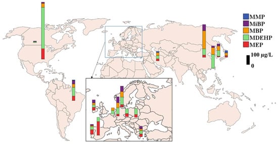 The urinary concentrations of phthalate metabolites in general populations vary among countries. Some of the highest concentrations of total phthalate metabolites were found in urine collected in 2006–2007 from Kuwaitis, with a maximum value of 19,300 µg/L and a median value for of 1050 µg/L []. The occurrence of phthalate metabolites was investigated in urine from Germans, and MBP was found at high concentrations (median: 49 µg/L) []. The median concentrations of phthalate metabolites in urine samples from Germany decreased significantly from 2002 to 2008 []. Similarly, urinary phthalate metabolites measured in 2015 were significantly lower than those in 2007 in Germany [].