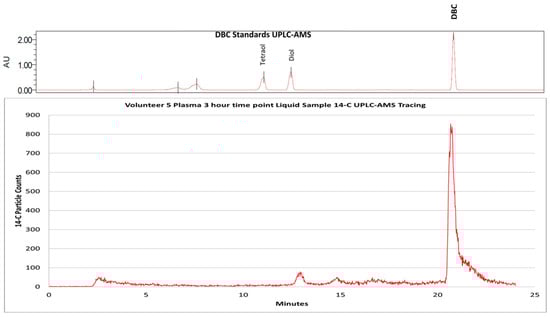 UHPLC-AMS of [14C]-DBC and putative metabolites from human plasma 3 h after and oral dose of 29 ng 14C-DBC. The use of unlabeled parent DBC and standards (DBC-(±)-11,12-diol and DBC-(±)-11,12,13,14-tetraol) (top graph) allow for the identification of 14C peaks in plasma (bottom graph).