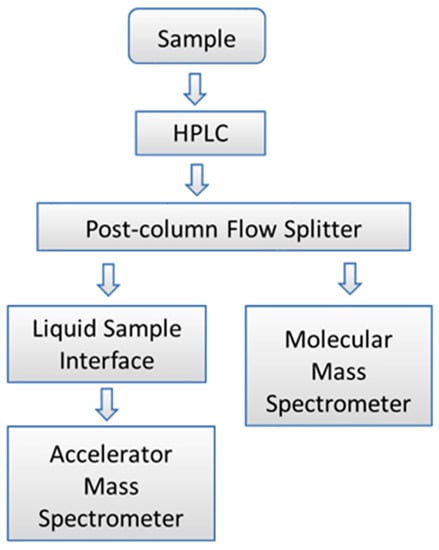 Historically, AMS measurements have required the use of off-line orthogonal analytical techniques to speciate analytes measured by AMS. This limitation was based on the need to convert analytical samples to graphite prior to AMS measurement, destroying all chemical information in the process []. The recent development of the AMS liquid sample interface has enabled measurement of liquid samples without the need for graphitization [,,]. The ability to measure liquid samples by AMS has also made it possible to integrate quantitative analysis with AMS sample measurements. The historical requirement for off-line speciation has been overcome by the recent development of a novel analytical technology that couples AMS directly with accurate mass spectrometry to enable real-time analysis of samples separated by high-performance liquid chromatography (HPLC). Based on the naming convention proposed by Sacks et al., this combined analytical method is referred to as parallel accelerator and molecular mass spectrometry (PAMMS) []. The LLNL PAMMS instrumentation is composed of a Waters Acquity H Class HPLC system, a Waters Xevo G2-XS QTOF instrument, an adjustable post-column flow splitter, a custom-built readout device, and the LS-AMS interface as depicted in the block diagram in Figure 2.